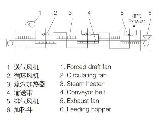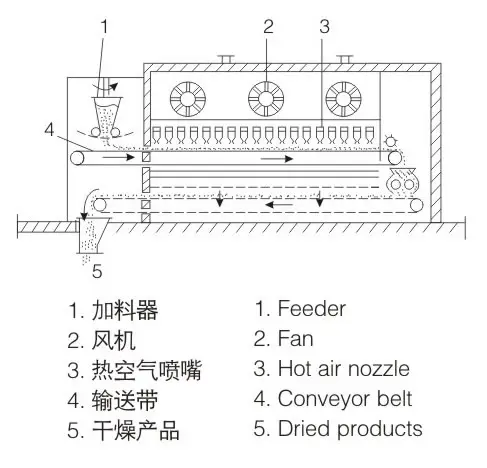该机是穿流连续式干燥设备,用于透气性好的片状、条状、颗粒状物料的干燥,对于脱水蔬菜,中药饮片等含水率高,而温度不允许高的物料尤为合适;该系列干燥机具有干燥速度快、蒸发强度高、产品质量好的优点。对脱水滤饼状的膏状物料,需经造粒或制成棒状后亦可干燥。