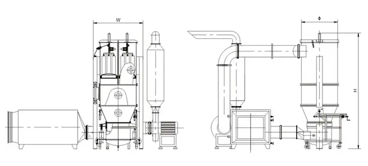 该机由主机、空气处理系统、加热系统、控制系统等组成。工作时,物料加入沸腾干燥机的料仓,按工艺要求设定程序和参数,整机开始工作。空气经过空气处理系统过滤、经加热系统加热后进入主机内,物料经热空气流化、干燥,水份迅速蒸发,物料被快速干燥。按设定的程序与参数完成操作后,将料仓推出与YTZ系列固定提升转料机扣合提升出料或利用真空上料器抽到高位整粒机整粒,有效地控制粉尘与交叉污染。