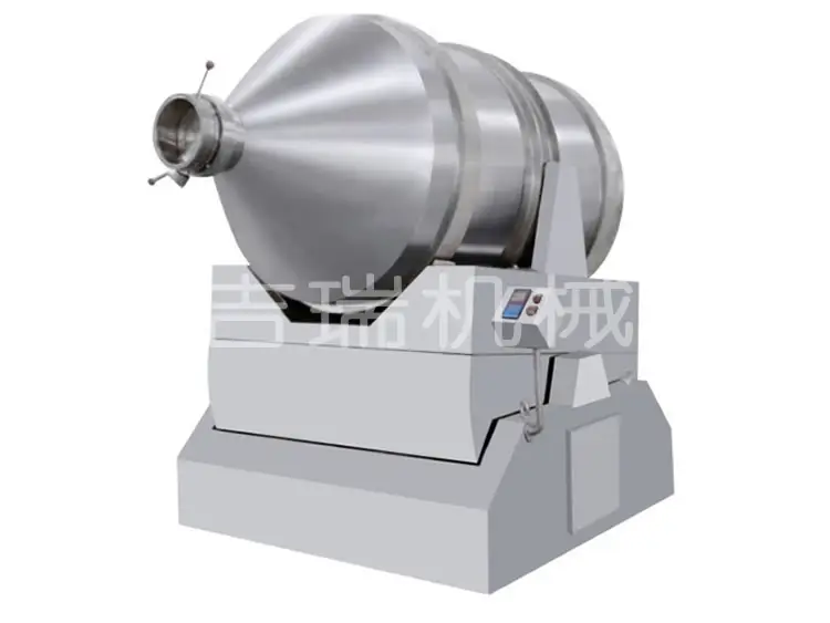 EYH系列二维运动混合机主要由转筒、摆动架、机架三大部分构成。转筒装在摆动架上,由四个滚轮支撑并由两个挡轮对其进行轴向定位。在四个支撑滚轮中,其中两个传动轮由转动动力系统拖动使转筒产生转动;摆动架由一组曲柄摆杆机构来驱动,曲柄摆杆机构装在机架上,摆动架由轴承组件支撑在机架上。特点